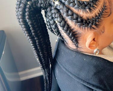 She had a stunning hairstyle with big braided hair that was adorned with extensions. The braids were intricately woven together, creating a beautiful and eye-catching pattern. The extensions added length and volume to her hair, making it even more impressive. To complete the look, the braided hair was gathered at the back, forming a sleek and stylish ponytail. The ponytail cascaded down her back, enhancing the overall elegance of her hairstyle. It was a bold and confident choice, showcasing her creativity and attention to detail. With her big braided hair and the stunning extension ending with a ponytail, she effortlessly stood out in any crowd